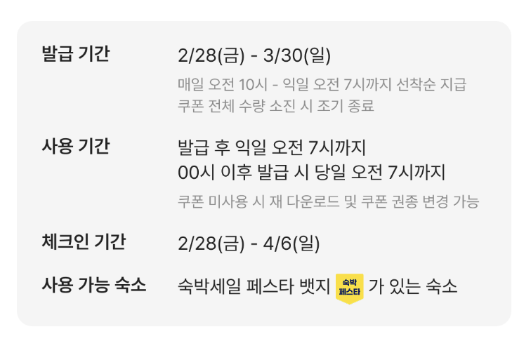 여기 어때에서 다운로드한 2025 대한민국 봄맞이 숙박 세일 페스타 쿠폰은 사용할 수 있는 숙소기간이 정해져 있어요. 2025년 2월 28일 금요일부터 2025년 4월 6일 일요일까지 체크인까지 적용이 가능하더라고요. 숙박세일 페스타 배지가 붙어있는 숙소만 예약 가능하니 찾을 때 이 노란 마크를 찾으시면 돼요~